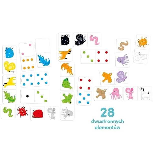 To jednocześnie układanka i gra, która rośnie razem z dziećmi. Elementy można łączyć na różne sposoby: kolorami, zwierzętami, kolorami i zwierzątkami lub tradycyjnymi oczkami. Zagrajcie razem w klasyczne domino lub łączcie kolorowe, duże elementy, poznając przy tym kolory i trenując spostrzegawczość i logiczne myślenie. Dostosujcie poziom trudności zabawy do rozwijających się umiejętności dzieci. Mnóstwo pomysłów na edukacyjne zabawy znajdziecie w poradniku dołączonym do zestawu!