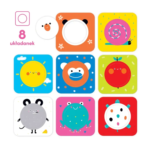Czas odkryć koło! Edukacyjny zestaw sprawdzi się jako pierwsze puzzle dla maluchów. Składa się 8 dużych dwuelementowych układanek. Zabawa polega na dopasowywaniu wyjmowanych kółeczek. Możecie je dowolnie wymieniać pomiędzy tabliczkami, co sprawia dodatkową radość. Pokaż maluchowi, że kółeczko pasuje do dziurki i opowiadaj, co jest na ilustracji. Wszystkie kółeczka są wymienne, dlatego możliwe są także nieoczywiste połączenia. Każde dopasowanie jest sukcesem i powodem do radości. Roczne dziecko bacznie obserwuje otoczenie. Coraz więcej rozumie, uczy się przez naśladowanie i poprzez codzienną zabawę doskonali nabywane umiejętności. Puzzle Odkrywam koło rozwijają małą motorykę i spostrzegawczość. To świetny sposób na poznawanie nowych pojęć. Przepis na dobrą zabawę. Cechy produktu: • zestaw zawiera 8 układanek (16 elementów), • duże elementy są wykonane z trwałej tektury, • odpowiednie dla dzieci w wieku od 12 miesięcy, • ilustracja i forma jest dostosowana do wieku dziecka, • zabawa rozwija małą motorykę i wyobraźnię. Rozmiar opakowania: 13.5 x 17.0 x 4.5 cm Rozmiar obrazka po ułożeniu: 11.0 x 11.0 cm