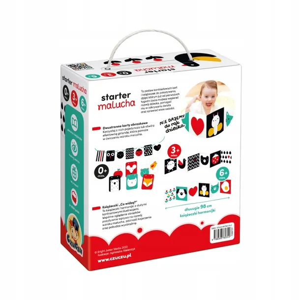 Nowa edycja Startera malucha to zestaw kontrastowych kart i książeczek do pokazywania, który sprawdzi się w pierwszym roku życia dziecka. Do zestawu dołączyliśmy poradnik z informacjami na temat rozwoju wzroku i pomysłami na wspólną zabawę. To świetny pomysł na prezent dla rodziców niemowląt. Wiek: 0-3-6 mies.+