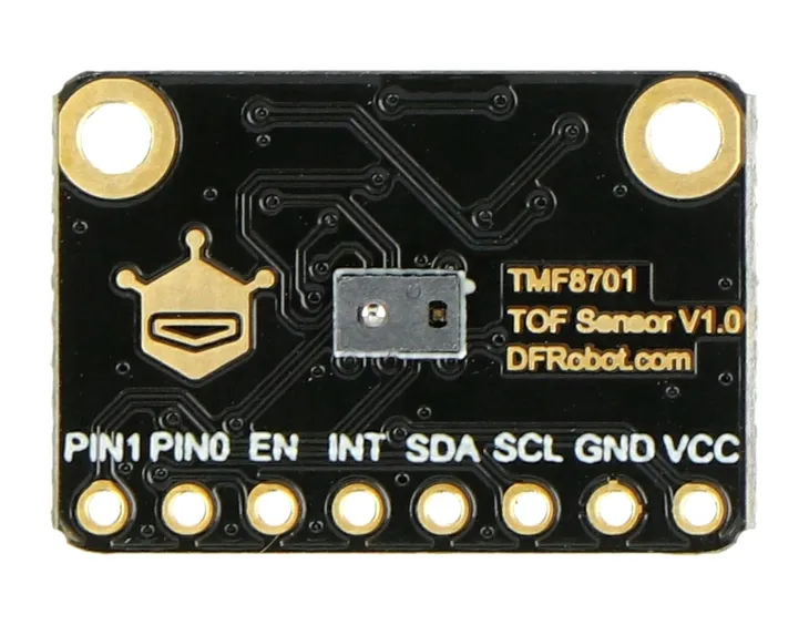 Moduł Fermion z czujnikiem odległości time-of-flight (ToF) TMF8701. Czujnik dokonuje pomiaru odległości na podstawie różnicy czasu pomiędzy impulsami świetlnymi. Wykrywa obiekty niezależnie od koloru, współczynnika odbicia i tekstury obiektu. Czujnik TMF8701 działa w trybie zbliżeniowym (od 1 cm do 10 cm) lub w trybie zasięgu (od 10 cm do 60 cm). Moduł do komunikacji wykorzystuje interfejs I2C, zasilany jest napięciem od 2,7 V do 3,3 V.