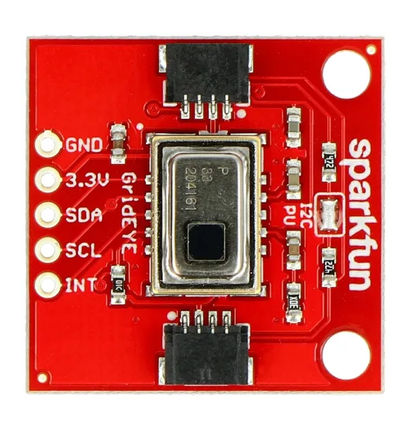 Moduł z czujnikiem podczerwieni AMG8833. Czujnik jest w rzeczywistości matrycą pomiarową o rozdzielczości 64 pikseli (8x8). Oferuje dokładność na poziomie 2,5°C i możliwość wykrywania ludzi na odległości do 7 m. Komunikacja z czujnikiem odbywa się przez interfejs I2C. Czujnik jako informację zwrotną wysyła temperaturę mierzoną niezależnie dla każdego z pikseli w zakresie od 0 do 80°C z częstotliwością odświeżania do 10 ramek/s. Czujnik może służyć jako kamera termowizyjna o małej rozdzielczości. Do modułu dostępna jest biblioteka umożliwiająca łatwą obsługę czujnika.