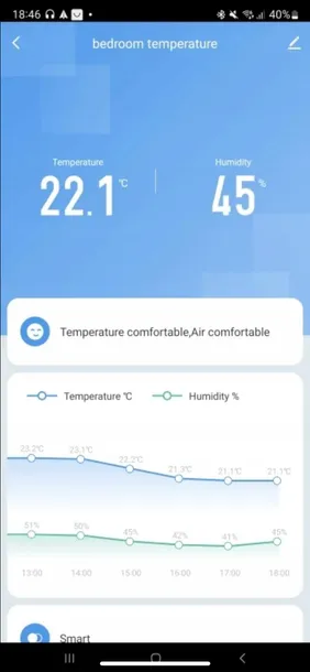 Nasz czujnik w czasie rzeczywistym monitoruje i rejestruje temperaturę oraz wilgotność w pomieszczeniu. Dzięki aplikacji masz dostęp do aktualnych oraz historycznych danych. W przypadku wykrycia nietypowych warunków środowiskowych, czujnik wyśle powiadomienie alarmowe na Twój telefon lub uruchomi zdefiniowany przez Ciebie scenariusz – na przykład włączy klimatyzację lub ogrzewanie za pośrednictwem inteligentnego gniazdka, przekaźnika lub głowicy termostatycznej.