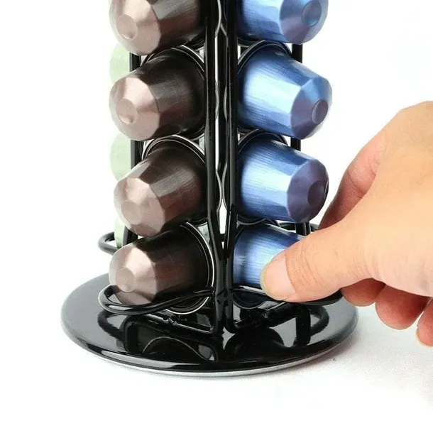 Obrotowy stojak na kapsułki Nespresso wykonany z metalu. Pozwala na wygodne i estetyczne przechowywanie do 40 kapsułek kawy. Dzięki obrotowej konstrukcji 360° zapewnia szybki dostęp do ulubionych smaków. Stabilna podstawa i kompaktowy rozmiar sprawiają, że stojak idealnie sprawdzi się w każdej kuchni.