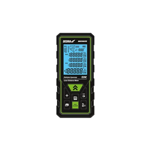 Dalmierz laserowy, o zasięgu do 50 m, z 7 funkcjami, 2 punktami odniesienia, długością wiązki lasera 635 nm, pamięcią 30 pomiarów, zakresem pomiaru kąta +/-90°, zasilany 2 x AAA - żywotność baterii do 8000 pomiarów.