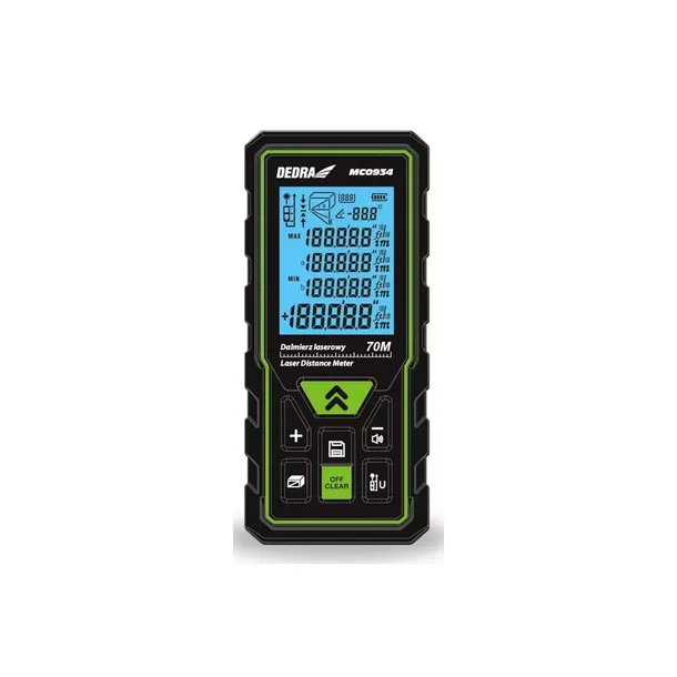 Dalmierz laserowy, o zasięgu do 70 m, z 7 funkcjami, 2 punktami odniesienia, długością wiązki lasera 635 nm, pamięcią 30 pomiarów, zakresem pomiaru kąta +/-90°, zasilany 2 x AAA - żywotność baterii do 8000 pomiarów.