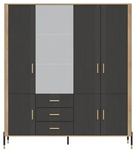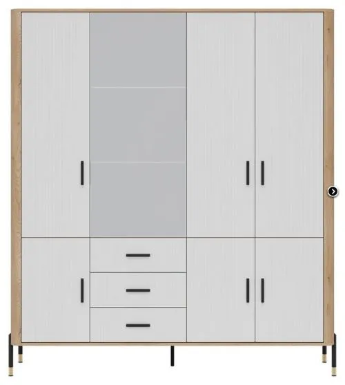 Imponująca forma, ponadczasowy styl. Dante DT17 to mebel, który nie tylko przyciąga wzrok eleganckim designem, ale także imponuje swoją funkcjonalnością. Ta przestronna szafa to idealna propozycja dla osób ceniących wysoką jakość wykonania, przemyślaną organizację przestrzeni oraz nowoczesne wzornictwo. Centralną część bryły zajmuje czworo dużych drzwi, które dają doskonały dostęp do praktycznych i pojemnych wnętrz. Drzwi z dużym lustrem nadają meblowi lekkości i elegancji. W dolnej części mebla znajdują się cztery praktyczne szuflady, które ułatwiają organizację drobnych akcesoriów. Mebel utrzymany jest w modnej kolorystyce: połączenie matu w pięciu odcieniach kolorystycznych do wyboru z dekorem drewna dębowego tworzy harmonijny i luksusowy kontrast. Całość wieńczą złote lub czarne, smukłe uchwyty i metalowe nóżki, które podkreślają nowoczesny, ale ciepły charakter mebla. Szafa Dante 7D – centrum stylu i funkcjonalności w Twoim wnętrzu. Ten model to znakomity wybór do salonu, jadalni lub gabinetu – tam, gdzie liczy się estetyka i perfekcyjna organizacja. Szafa DT17, który stworzy przestrzeń pełną charakteru.