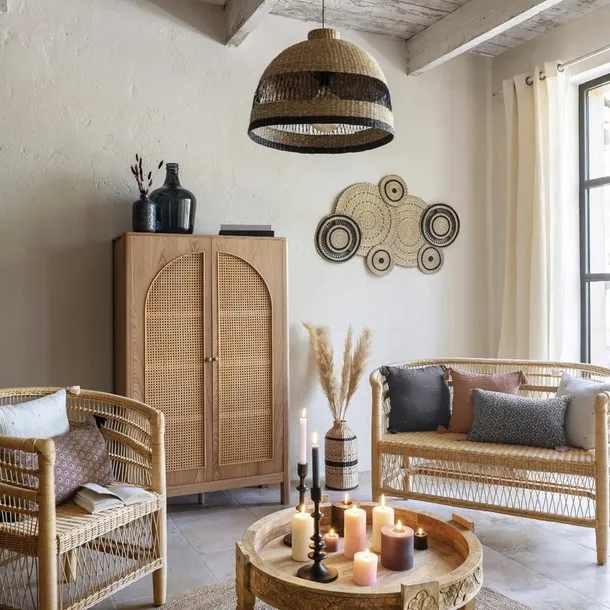 Dekoracja ścienna wtrąca natychmiastowy styl i urok każdemu pomieszczeniu, które zaszczyci swoją obecnością. Zachwycający element ma wspaniały charakter boho, który z pewnością przyciągnie natychmiastową uwagę Twoich gości. Dzięki harmonijnym wymiarom, ozdobę można umieścić w salonie nad meblem lub wykorzystać jako zagłówek. Dobrze komponuje się z materiałami takimi jak drewno i juta roślinna.Niezależnie od tego, czy chcesz rozjaśnić swój salon, poprawić nastrój w przedpokoju, czy odświeżyć pustą ścianę, to wspaniałe dzieło sztuki będzie idealnym dodatkiem do każdego domu. Dzięki unikalnemu wzornictwu i ekscytującej estetyce możesz być pewien, że każdy, kto przejdzie obok niego, zatrzyma się, aby podziwiać jego piękno - więc nie wahaj się, zamów swój własny już dziś!Połącz dekorację ścienną z kredensem z malowanego drewna Atmosphera, aby wnieść do swojego wystroju odrobinę radości życia.