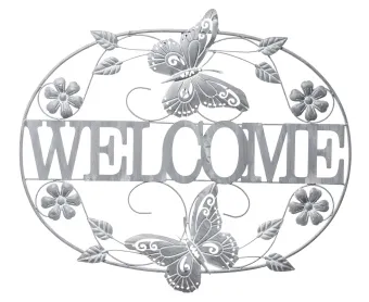 Metalowa dekoracja z wymownym hasłem 'WELCOME'.