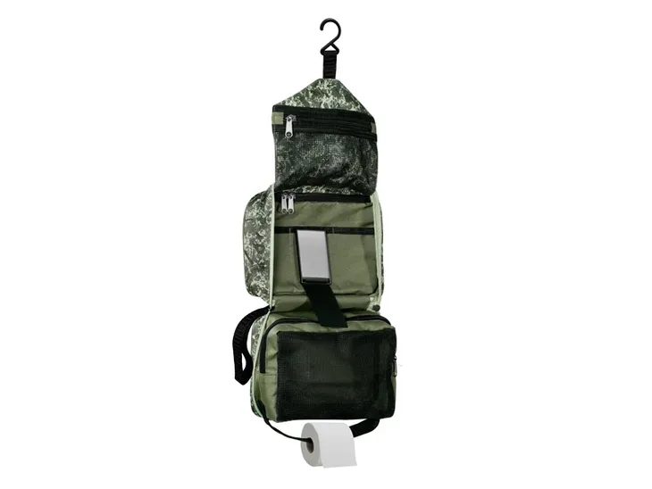 Torba na przybory toaletowe Delphin Nice SPACE C2G to praktyczna torba na wszystkie Twoje przybory toaletowe i kosmetyki. Teraz możesz mieć je wszystkie przechowywane w jednej prostej torbie. Posiada ona pasek na rzep z plastikowym haczykiem, dzięki któremu można ją umieścić wewnątrz namiotu lub zaczepić na gałęzi drzewa. W dolnej części torby znajduje się kolejny pasek z rzepem, który można przełożyć przez rolkę papieru toaletowego, aby wygodnie ją rozwinąć. Wewnątrz znajduje się kieszeń na papier toaletowy i inne kieszenie do przechowywania z zamkiem błyskawicznym. Środkowa część ma trzy przegrody do przechowywania grzebienia, szczoteczki do zębów, nożyczek i innych przydatnych przedmiotów. Znajduje się tam również małe wyjmowane lusterko (5,5x8 cm) z plastikową osłoną przymocowaną do torby za pomocą zamka błyskawicznego na rzep. Na zewnętrznej stronie torby znajduje się uchwyt ułatwiający transport.