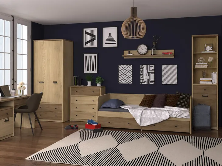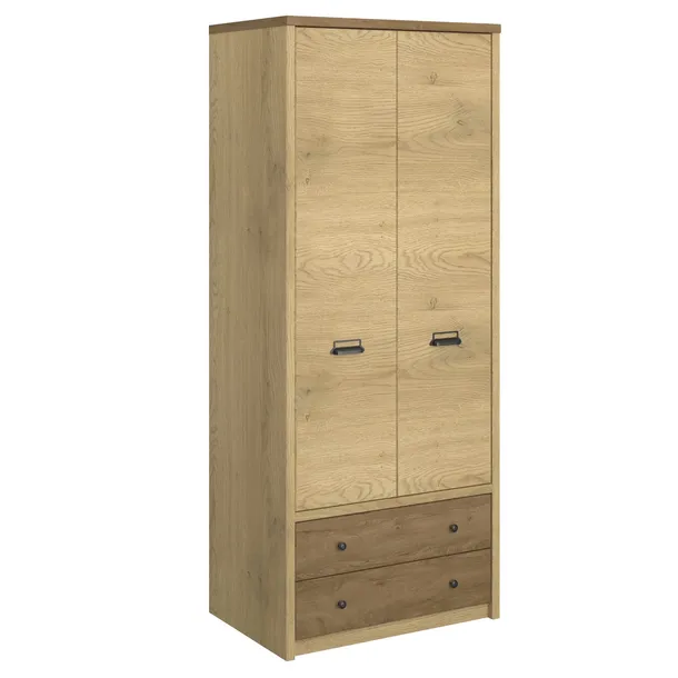 Szafa Denzel 2d2s to połączenie prostoty i praktyczności w loftowym wydaniu. Kolory dąb cremona i dąb lefkas tworzą ciepły kontrast, a metalowe uchwyty podkreślają nowoczesny charakter mebla. Dwie pojemne szuflady i przestrzeń z drążkiem sprawiają, że to idealna szafa do pokoju młodzieżowego lub sypialni. Jej elegancki wygląd wprowadza do wnętrza harmonię i styl.
