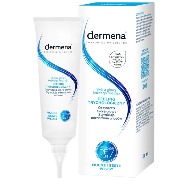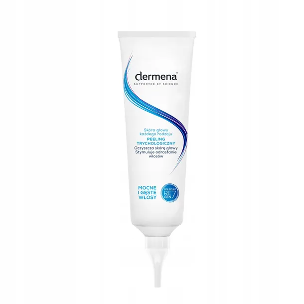 Peeling trychologiczny dermena® skutecznie oczyszcza i odświeża skórę głowy, przygotowując ją do dalszej pielęgnacji. Drobinki peelingujące pochodzenianaturalnego usuwają ze skóry głowy martwy, łuszczący się naskórek, zanieczyszczenia oraz pozostałości po kosmetykach stylizacyjnych. Peeling reguluje pracę gruczołów łojowych, ograniczając przetłuszczanie się skóry głowy i włosów. Regularnie stosowany redukuje nadmierne wypadanie włosów i stymuluje ich odrastanie. Jego łagodna formuła nie podrażnia, nie przesusza skóry głowy.
