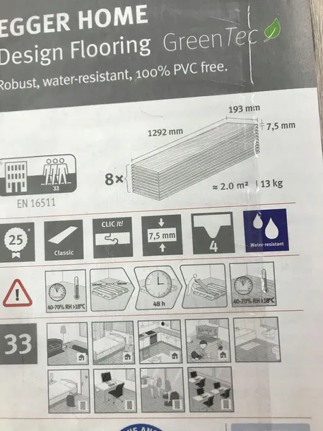 TRWAŁA: Podłoga EGGER GreenTec Design jest odporna na wszelkie wpływy. Dzięki innowacyjnej warstwie użytkowej jest trwała, odporna na mikrozarysowania i plamy. Dzięki klasie użytkowania 33 nadaje się również do wymagających zastosowań komercyjnych. WODOODPORNA: Dzięki specjalnej konstrukcji z wodoodporną powierzchnią, rdzeniowi GreenTec o bardzo niskim pęcznieniu oraz elastycznej konstrukcji Clic it! System montażu sprawia, że wszystko po prostu spływa z podłóg GreenTec Design.
