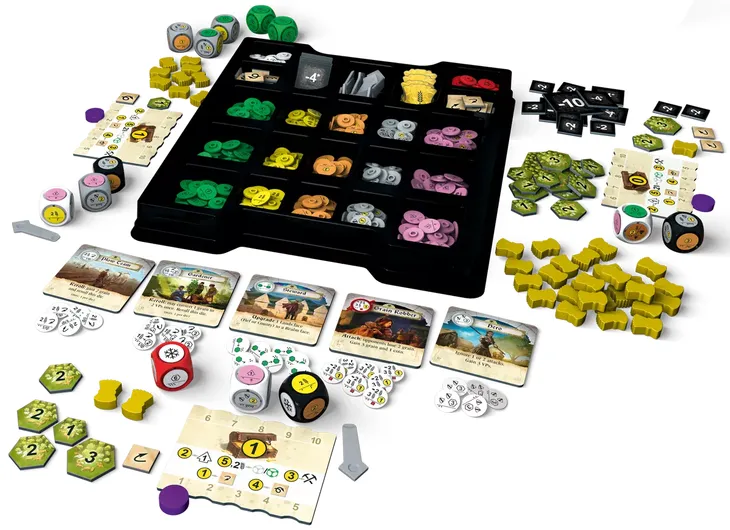 Each game is different as during setup, players draw five tiles (from a bag of 35) to determine which extra die faces will be available beyond the five standard lines of faces: lands (victory points), farming (grain), commerce (coins), settlements (defense), and progress (upgrades). Each player begins with two identical dice and can gain more dice during play, in addition to upgrading their starting dice.