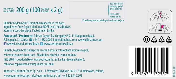 - Kraj pochodzenia/Wyprodukowano w: Sri Lanka