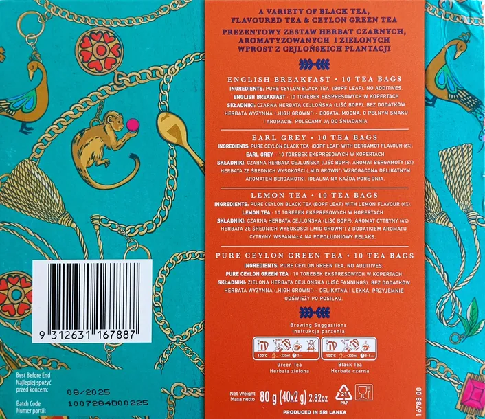 Herbaciany zestaw złożony z 4 rodzajów herbat - czarnych, czarnych aromatyzowanych i zielonych. Różnorodna kombinacja, doskonała na co dzień jak również na poczęstunek dla gości. W pudełku znajduje się klasyczna kompozycja śniadaniowa English Breakfast (pełna w smaku, mocna, aromatyczna, pobudzająca), wyrazista herbata Earl Grey z olejkiem bergamoty, delikatna i orzeźwiająca zielona herbata Pure Ceylon Green oraz cejlońska czarna herbata Dilmah Lemon o aromacie cytryny. Całość umieszczona w eleganckim pudełku - wspaniały prezent.