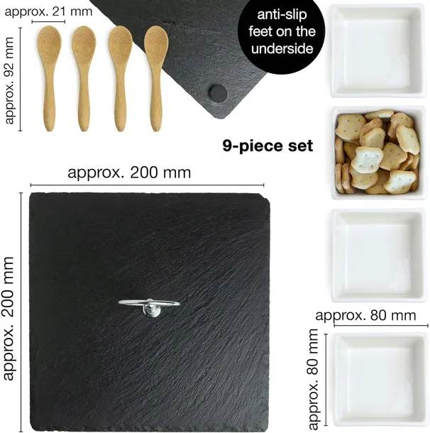 - ➡️Praktyczna – taca do serwowania, duża i antypoślizgowa nóżka, miseczki można myć w zmywarce i używać w kuchence mikrofalowej, łyżka bambusowa i płyta łupkowa łatwe do czyszczenia ręcznie
