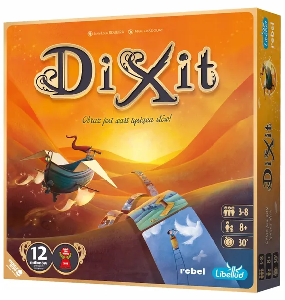 Wstrzymaj na chwilę oddech! Karty zostały odkryte. Ich wspólną cechą jest tajemnicze zdanie, lecz tylko jedna z kart jest do niego kluczem. Użyj swojego sprytu i intuicji, by nie dać się złapać w pułapkę zastawioną przez pozostałych graczyDixit to wesoła i zaskakująca gra skojarzeń do wspólnego odkrywania w gronie przyjaciół i czym to polega?Dixit to narracyjna gra karciana, w której wymyślamy i odgadujemy skojarzenia do wieloznacznych, bogato ilustrowanych kart. W każdej rundzie jedna z osób zostaje Bajarzem - wybiera dowolną kartę z ręki i podaje hasło, które jej zdaniem odzwierciedla obrazek. Może to być pojedyncze słowo, całe zdanie, cytat lub fragment piosenki czy filmu. Kolejne osoby wybierają spośród swoich kart po jednej pasującej do słów Bajarza, a następnie wszystkie obrazki są tasowane. Zadaniem graczy jest odgadnięcie, który obrazek był tym ść pudełka:plansza84 karty8 żetonów do głosowania8 drewnianych króliczkówinstrukcja