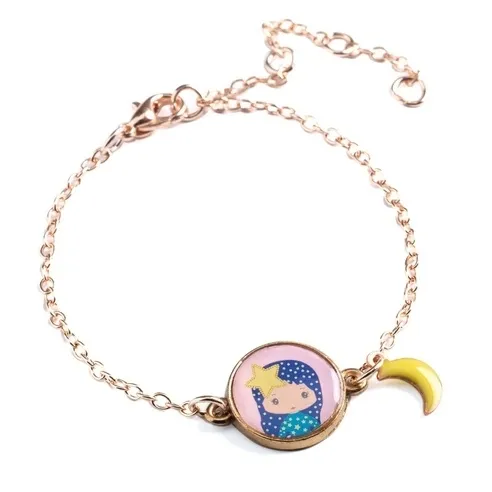 Odkryj bransoletkę Luz z kolekcji Tinyly marki Djeco, składającej się z ilustrowanego medalionu na metalowym łańcuszku w kolorze złotym. Łańcuszek ozdobiony jest kolorowym charmsem w kształcie księżyca. Bransoletka ma regulowane zapięcie .