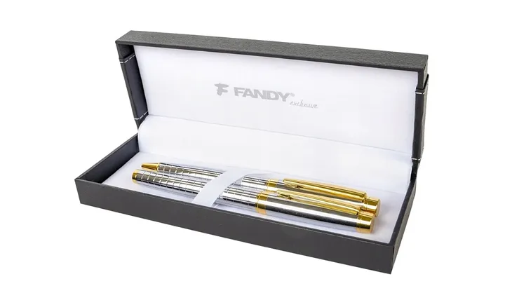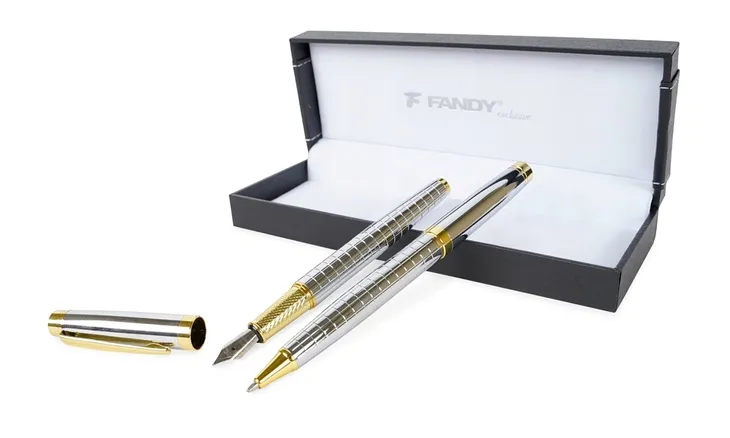 Zaprezentuję Państwu zestaw piśmienny Centaurus BF srebrny marki Fandy. Ten elegancki zestaw składa się z metalowego długopisu i pióra wiecznego, które doskonale połączą funkcjonalność i styl w jednym.