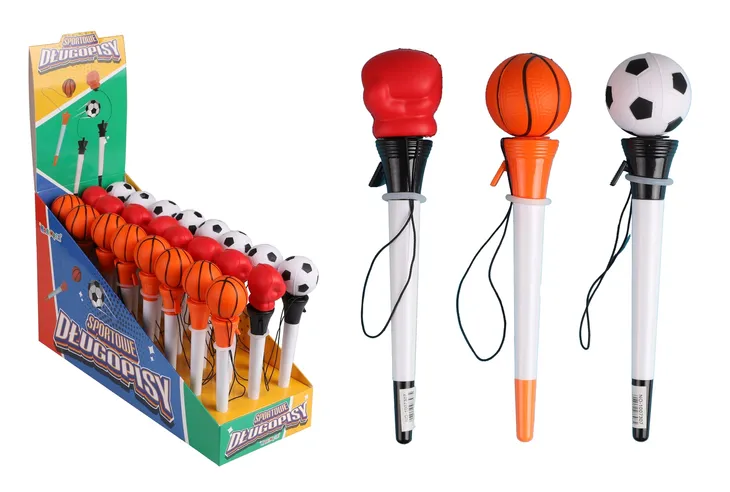 Sportowy długopis o nietypowym designie, który łączy funkcjonalność z zabawą. Długość długopisu to 17,5 cm, co zapewnia wygodę użytkowania. Występuje w trzech wzorach: piłka do koszykówki, piłka do nogi oraz rękawica bokserska. Każdy z nich posiada unikalny mechanizm – po naciśnięciu przycisku ozdobny element wyskakuje na gumce, co dodaje zabawie interaktywnego charakteru.