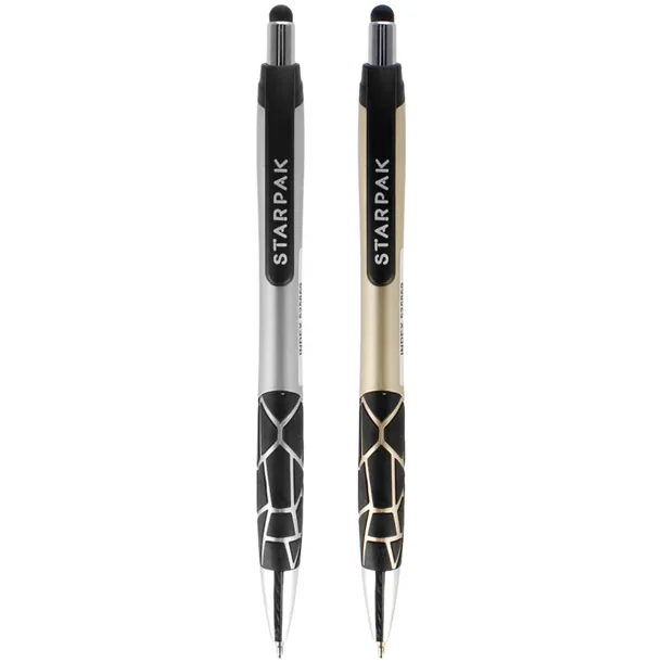 Zalety produktu: Długopis automatyczny Mozaika z kolekcji STARPAK z tuszem w niebieskim kolorze. Opakowanie-display zawiera 36 szt. długopisów automatycznych. Długopis zapewnia wysoki komfort pisania, linia pisania 1mm. Wykonany z wysokiej jakości materiałów. Długopis występuje w dwóch wersjach kolorystycznych: srebrnym, złotym. Pakowany w displayu po 36 sztuk. W kartonie po 432 szt. Wykonany z plastiku. Zapoznaj się również z innymi produktami Starpak Produkt nieodpowiedni dla dzieci poniżej 3 roku życia. Wymiary produktu: 14 cm. x szer. x gł. cm : 15x13x13. Waga opakowania kg. 0,43 kg. Cechy produktu: modele szkolne i biurowe, grubość linii pisania od 0,5mm do 1mm, mechanizm długopisów automatycznych gwarantuje wysoką trwałość, linia pisania jest ciągłą i równa, bez przerw, zgrubień i zmiennej tonacji, zastosowany atrament jest trwały i nie blaknie pod wpływem światła. W ofercie STARPAKA znajduje się 55 różnych modeli długopisów. Od śmiesznych z motywami zabawnych zwierzaków, przez klasyczne długopisy szkolne, praktyczne biurowe po eleganckie długopisy idealne do damskiej torebki. Każdy znajdzie coś dla siebie. Wszystkie długopisy STARPAK charakteryzują się wysoką jakością tuszu i końcówki piszącej. Dzięki temu linia pisania jest ciągła i równa, bez przerw, zgrubień i zmiennej tonacji. Grubość linii pisania to 0,5mm, 0,7mm i 1,00mm. Tusz STRAPAK jest tez bardzo trwały i nie blaknie pod wpływem światła. W długopisach automatycznych STARPAK zastosowaliśmy bardzo trwały i wytrzymały mechanizm wysuwania wkładu. Długopisy wielokolorowe STARPAK zastępują 6 długopisów w różnych kolorach. Dla uczniów STARPAK ma specjalny długopis z chowanym notesikiem. Bardzo pomocny przy wszelkiego rodzaju klasówkach i sprawdzianach. Długopisy STARPAK są dostępne w blistrach, woreczkach z zawieszką, pudełkach i displayach.
