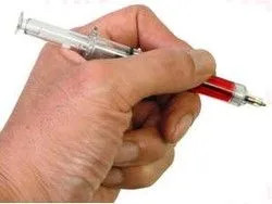 Świetny prezent i super gadżet, dzięki któremu nabierzesz nauczycieli i kolegów w szkole, czy koleżanki i kumpli z pracy, albo pasażerów w autobusie. Długopis do złudzenia przypomina strzykawkę wypełnioną krwią. Więc gdy już wszyscy ochłoną, po tym jak wyciągniesz strzykawkę z kieszeni czy torby i przyłożysz ja mimochodem do ręki, będziesz mógł im napisać: wyluzujcie, wkręciłem was.