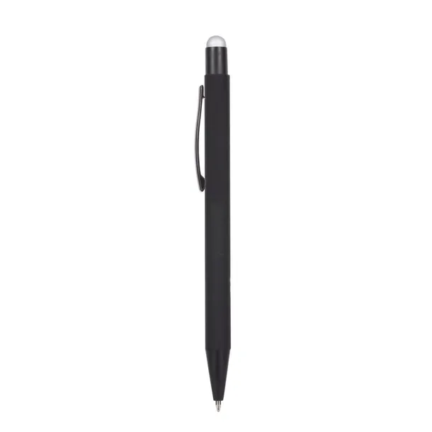 Długopis, touch pen, czarny gumowany trzon, grawer ukazuje powierzchnię w kolorze zbliżonym do koloru gumowej końcówki