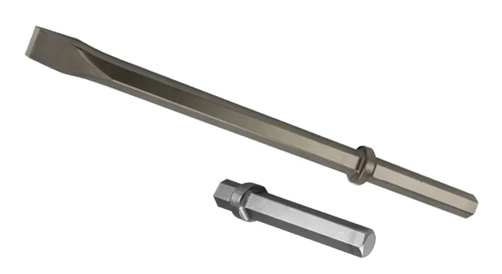 Dłuto z pierścieniem, z uchwytem sześciokątnym, przeznaczone jest do młota HITACHI ---> HIKOKI H90SG. Przedstawiony osprzęt służy do kucia, wkuwania się w twarde powierzchnie. Zastosowanie wysokiej jakości stali znacząco poprawia wytrzymałość osprzętu i wpływa na komfort pracy. Poddawane procesom hartowania i odpuszczania dla uzyskania optymalnej trwałości, dodatkową ochronę powierzchni zapewnia specjalny proces oczyszczania.