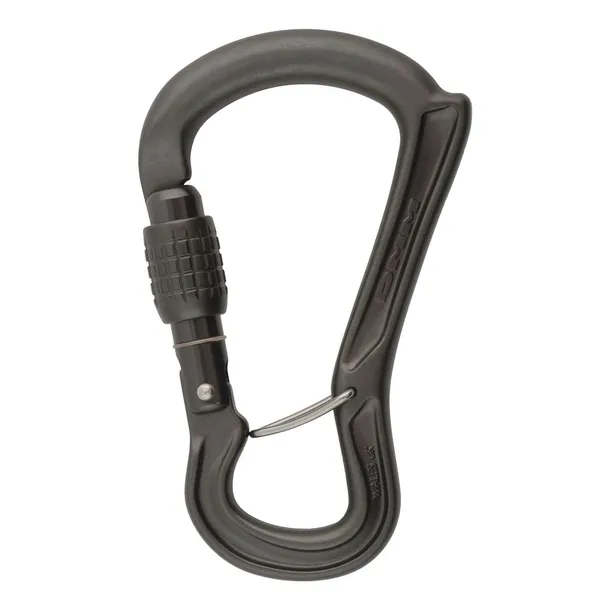 Zakręcany karabinek z poprzeczką zapobiegającą obracaniu się karabinka podczas asekuracji.