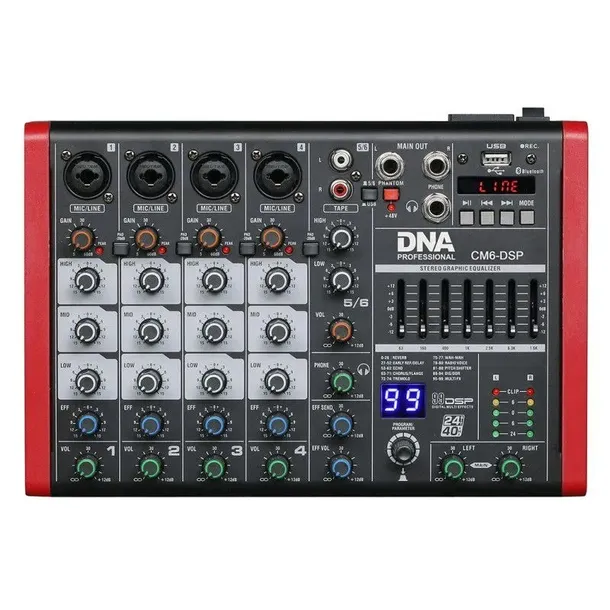 DNA CM6-DSP to kompaktowy, 6-kanałowy mikser dźwięku USB z odtwarzaczem MP3 i standardem bezprzewodowej komunikacji Bluetooth. Urządzenie wyposażone zostało w cyfrowy procesor efektów oferujący 99 różnych modulacji dźwięku, graficzny equalizer oraz zasilanie Phantom +48V, dzięki któremu możliwe jest podawanie stałego napięcia do niektórych urządzeń audio, instrumentów czy mikrofonów. To świetne rozwiązanie dla wokalistów, zespołów, mobilnych DJ-ów, a także firm eventowych oraz różnego typu instytucji.