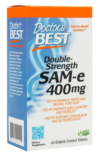 SAM-e, czyli S-adenozylometionina, to organiczny związek chemiczny występujący w każdej ludzkiej komórce. Suplement Doctor’s Best zawiera 400 mg substancji aktywnej w jednej tabletce.