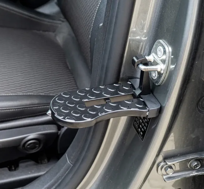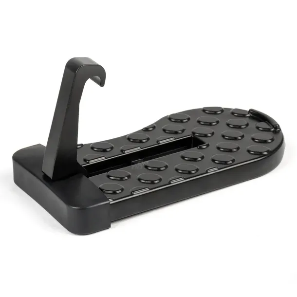 Uniwersalny, aluminiowy podest samochodowy, który został zaprojektowany jako dodatkowy stopień ułatwiający dostęp do dachu pojazdu. Montaż tego podestu jest prosty i wygodny, nie wymaga inwazyjnych działań. Można go zamontować na elemencie zamka drzwi w karoserii samochodu, a specjalna pianka na uchwycie chroni karoserię przed zarysowaniami.