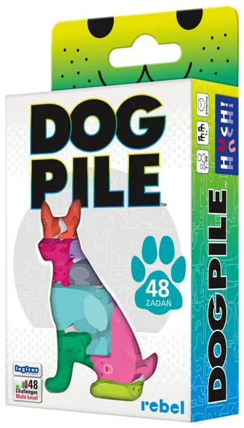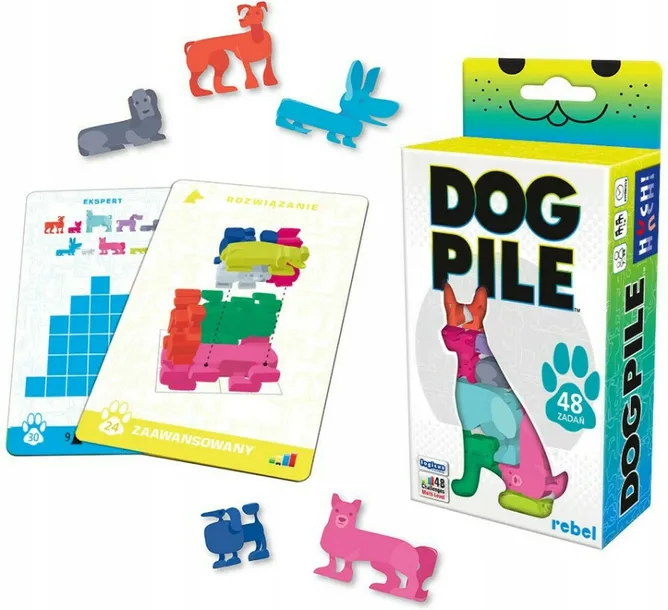 Wysil swój umysł i wypełnij dostępną przestrzeń psiakami o różnych kształtach i rozmiarach. I pamiętaj: przestrzeń bez psa to przestrzeń stracona!Zasady Dog Pile są banalnie proste i można je zamknąć w trzech krokach:Wybierz układankę.Przygotuj ąż zagadkę w taki sposób, żeby elementy zmieściły się na określonej przestrzeni.W pudełku znajduje się aż 48 łamigłówek wraz z odpowiedziami, zapewniających świetną, intelektualną zabawę.