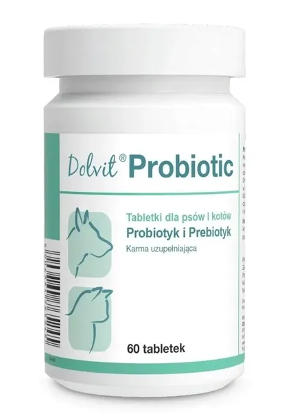Tabletki dla psów i kotów. Dolvit Probiotic zawiera probiotyki i prebiotyki wspomagające prawidłowe funkcjonowanie przewodu pokarmowego.