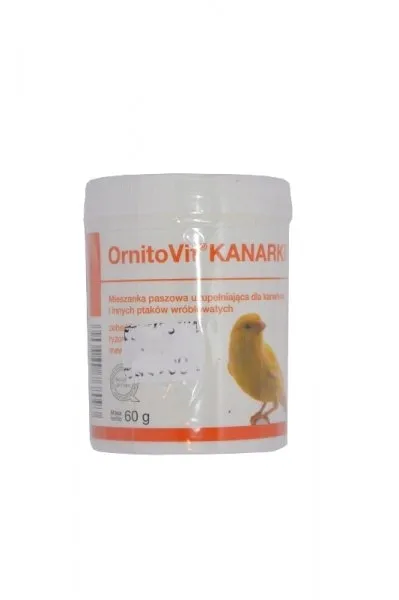 OrnitoVit Kanarki Dolfos 60g to kompleksowa mieszanka zawierająca szeroki zakres witamin (m.in. A, D3, E, C, B-kompleks, biotyna, niacyna, kwas pantotenowy), składników mineralnych (miedź, jod, selen) oraz egzogennych aminokwasów (DL-Metionina, L-Lizyna). Podstawą preparatu są laktoza i glukoza, a jego skład jest zgodny z normami UE.