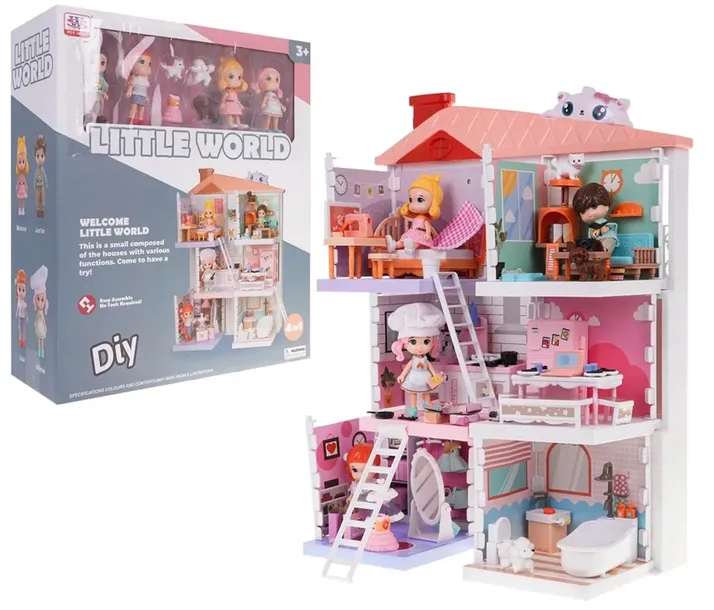 Śliczny, bogato wyposażony domek dla lalek z licznymi akcesoriami i 4 figurkami postaci w zestawie dla dzieci od 3-go roku życia. Domek składa się z 3 kondygnacji. Na parterze znajduje się bogato wyposażona garderoba i łazienka. Schodami w górę dostajemy się na drugie piętro, gdzie znajduje się kuchnia, a piętro wyżej, pokój dzienny i sypialnia. Wszystkie pomieszczenia wyposażono w meble i niezbędne sprzęty użytku domowego. Do zestawu dołączono również 4 figurki, 3 dziewczynki i jeden chłopiec. Cały zestaw wykonano z najlepszych materiałów i zadbano o dopracowanie najdrobniejszych szczegółów. Fantastyczne, żywe kolory przyciągają wzrok i zachęcają do zabawy. Niebywałą atrakcją zestawu możliwość rozłożenia domku na pojedyncze pomieszczenia i bawienia się nimi z osobna.