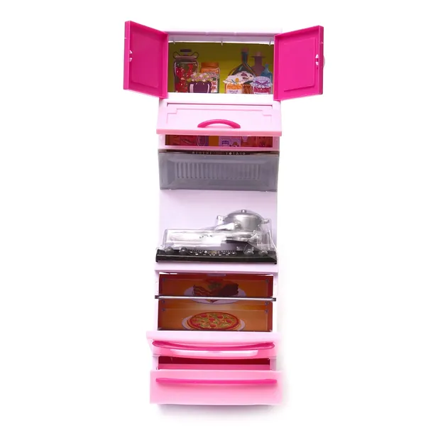 Duży zestaw mebelków dla lalek typu Barbie lub Steffi. Zestaw składa się kuchenki i szafkize zlewem. Wszystkie drzwiczki są otwierane.
