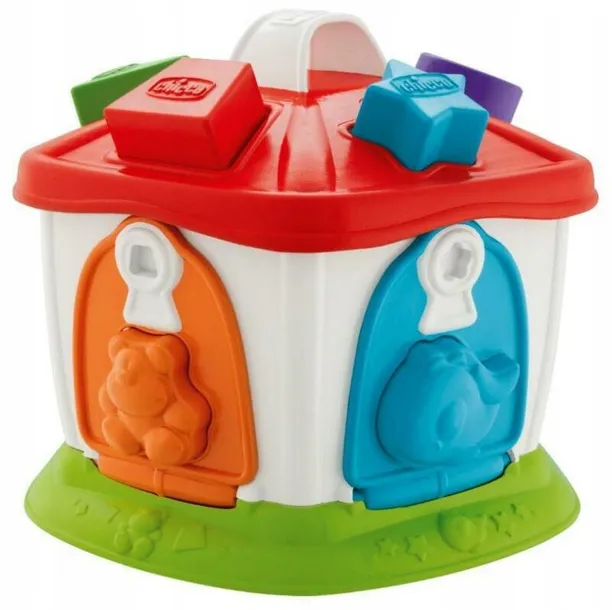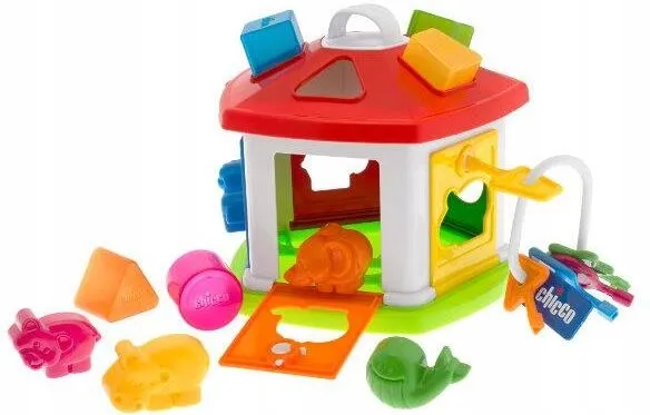 Wesoły domek zwierzat z pokojami i drzwiami, z wieloma kolorowymi foremkami do wkłądania w odpowiednie otwory. Pomaga dziecku uczyć się dopasowywania form i kolorów. Wszystkie foremki można odzyskać po otwarciu drzwiczek zabawki specjalnymi kluczami. Zabawka uczy rozpoznawać kolory i kształty oraz logicznego myślenia. Zabawka wyposażona w praktyczną rączkę do przenoszenia.