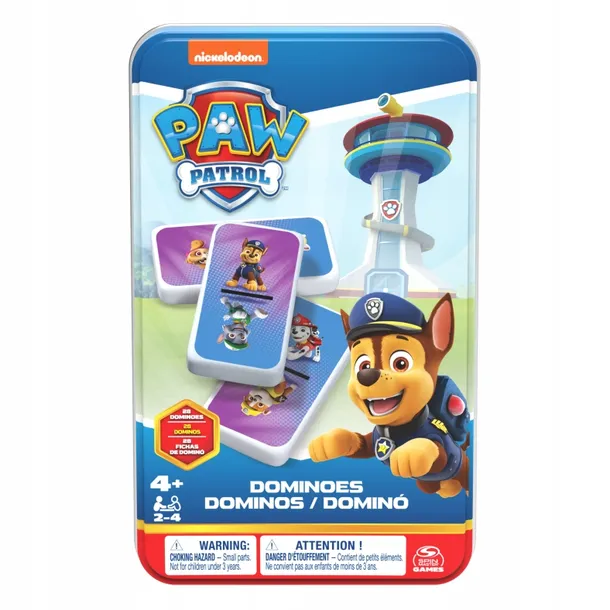 PSI PATROL, DOMINO: W tym zestawie do gry w domino dla dzieci w wieku od 4 lat znajdziesz 28 jasnych plastikowych kostek domina oraz instrukcję do gry. Gry dla 2-4 graczy, idealne na rodzinny wieczór. PRZENOŚNY BLASZANY POJEMNIK: Domino Psiego Patrolu można schować do wygodnej, dostosowanej dla małych rączek wygodnej puszki. Twoje dzieci mogą z łatwością zabrać swoją nową zabawkę do szkoły lub na spotkanie z przyjaciółmi. TWOJE ULUBIONE SZCZENIAKI: W tej grze dla dziewcząt i chłopców znajdują się wszystkie ukochane szczeniaki, w tym Chase, Skye, Marshall, Rubble i wielu więcej. Jeśli Twoim dzieciom nie wystarczy multum zabawy, jakie niosą ze sobą zabawki z serii Psiego Patrolu, warto wypróbować te zabawne gry dla dzieci w wieku 4-8 lat. PUZZLE, ZABAWKI I GRY OD SPIN MASTER: Świat puzzli i rodzinnych gier planszowych dla dzieci, młodzieży i dorosłych. Do tego gry strategiczne, karty i klasyczne gry planszowe, takie jak domino, mahjong lub szachy.