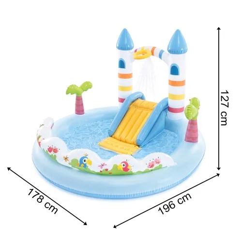 Wodny plac zabaw zamek + jednorożec, zjeżdżalnia zraszacz 196x178x127 cm Intex 56148NP