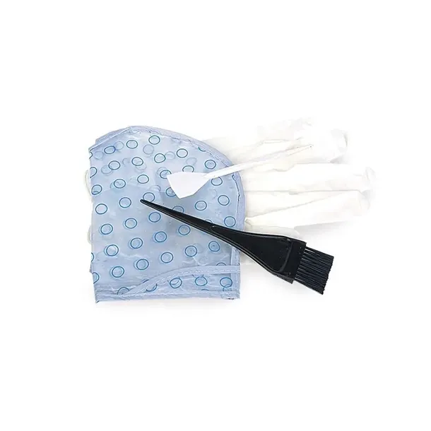 Komplet zawiera: dwuwarstwowy czepek z otworami, pędzelek do nakładania farby, ochronne antyalergiczne rękawiczki oraz łopatkę z haczykiem.