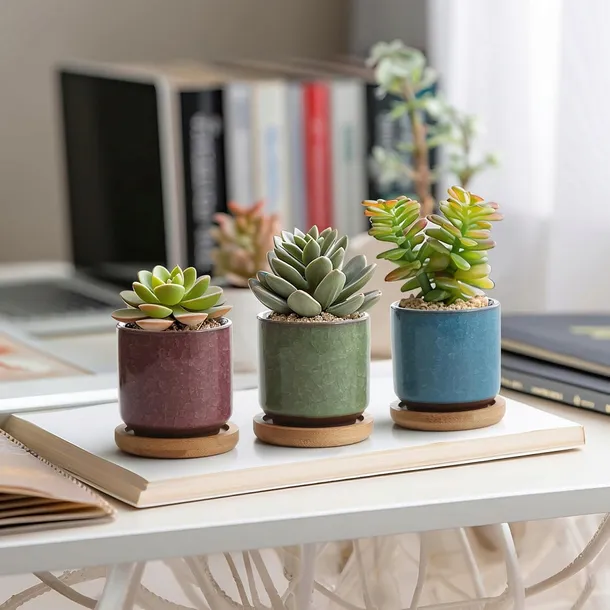 Ten elegancki zestaw ceramicznych doniczek z podkładkami z litego drewna to połączenie stylu i funkcjonalności – doskonały zarówno do domu, jak i biura.