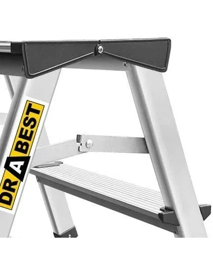 Do produkcji drabiny wykorzystano aluminium najwyższej jakości, co gwarantuje jej długą żywotność. Ta dwustronna drabina oferuje szereg praktycznych rozwiązań, doskonale sprawdzających się zarówno w codziennym użytkowaniu, jak i podczas drobnych prac remontowo-budowlanych, zarówno w domach, jak i w przedsiębiorstwach usługowych. Wyposażenie produktu obejmuje antypoślizgowe, karbowane, szerokie stopnie oraz specjalistyczne stopki na podłużnicach, które zapobiegają przesuwaniu się drabiny w trakcie wykonywania zadań. Stopnie są przynitowane do podłużnic i dodatkowo zabezpieczone w punktach nitowania. Podłużnice połączono specjalnymi paskami, które chronią drabinę przed nadmiernym rozłożeniem. Jej maksymalne obciążenie wynosi 125 kilogramów. Zaprojektowana głównie do użytku wewnętrznego, charakteryzuje się lekkością i kompaktowymi wymiarami, co ułatwia jej przechowywanie i transport. Co więcej, produkt dostępny jest w bardzo atrakcyjnej cenie.