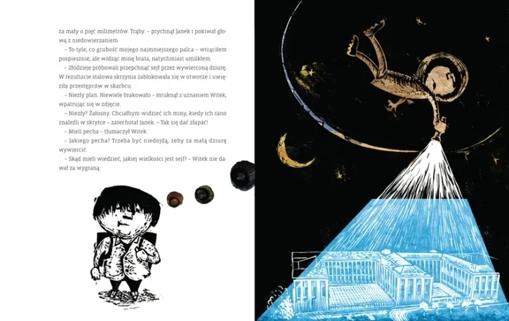 „– Mogę wejść, gdzie chcę, nawet do skarbca. Albo do muzeum. Nocą. Jeśli tylko będę miał ochotę! – przechwala się Janek, po czym zakłada się z kolegami, że... zdoła zakraść się do muzeum, wynieść z niego dzieło sztuki tak, by całą aferę opisały gazety”. A zatem nie ma odwrotu! Janek bierze na cel zbiory Muzeum Narodowego w Warszawie, a do udziału w nocnej eskapadzie namawia Stefka, swojego młodszego brata, ale też nieświadomego niczego dziadka Edka. Intryga rozkręca się z minuty na minutę, coś, co wyglądało na dziecinne łatwe, zamienia się w katastrofę! Ale czy na pewno? Sensacyjna akcja Draki w Muzeum przeplata się z fascynującą opowieścią o sztuce. Pojawia się Bitwa pod Grunwaldem (i jej powojenne losy), weduty Canaletta (i ich wykorzystanie do odbudowy Warszawy), Bitwa pod Orszą, malowidła z Faras, zbiory monet, kolekcje miniatur i greckich waz. Nuda, powiecie? Sami się przekonajcie. Wartka akcja, duża dawka humoru, liczne zwroty akcji, a do tego ciekawe ilustracje łączące komiksowy styl z dowcipem sytuacyjnym to najlepszy przepis na powieść przygodową.