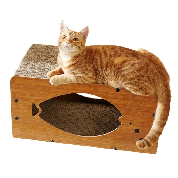 Posiada wiele okienek, a góra i dół są wypełnione tekturą falistą, która służy jako drapak oraz legowisko.