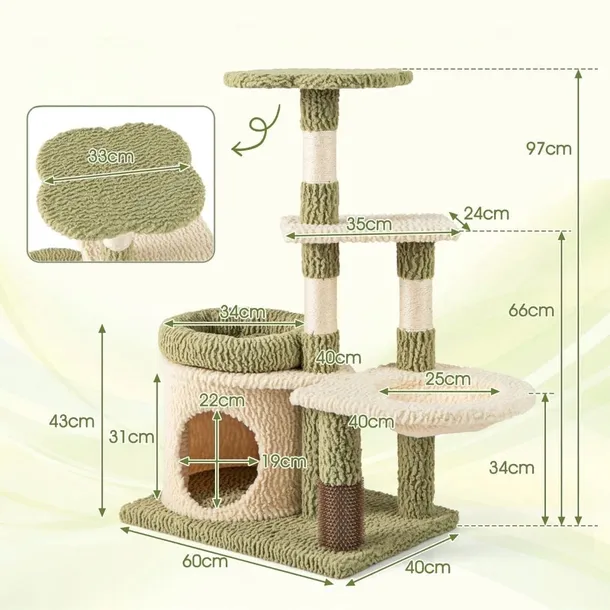 Podaruj swojemu kotu wyjątkowe miejsce do odpoczynku z naszym wielopoziomowym drapakiem, który łączy funkcjonalność z komfortem! Drapak o wysokości 97 cm oferuje przytulny domek, wygodne legowisko, relaksujący hamak oraz platformę do obserwacji – wszystko, czego kot potrzebuje, by czuć się wyjątkowo. Wbudowane słupki pokryte naturalnym sizalem pozwalają na pielęgnowanie zdrowych nawyków drapania, a dołączona szczotka do pielęgnacji futra sprawia, że Twój pupil zawsze będzie wyglądał nienagannie. Każda platforma jest obita miękkim pluszem, a zdejmowana poszewka legowiska ułatwia utrzymanie czystości. Ponadto, drzewko ma nie tylko funkcję użytkową, ale również stanowi stylową ozdobę Twojego wnętrza.