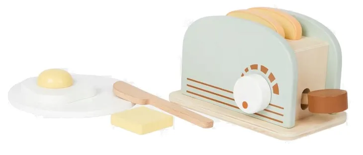 Drewniane zabawki - urządzenia kuchenne: toster, ekspres do kawy i mikser z akcesoriami (m.in. tosty, jako, nożyk, filiżanka).