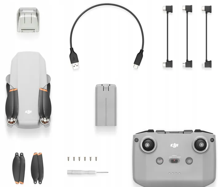 - 1x zapasowe śmigła, 1x Inteligentny akumulator, 3x kabel do połączenia kontrolera z telefonem, DJI Mini 4K, Kabel do ładowania USB-C, Kontroler DJI RC-N1, Osłona gimbala