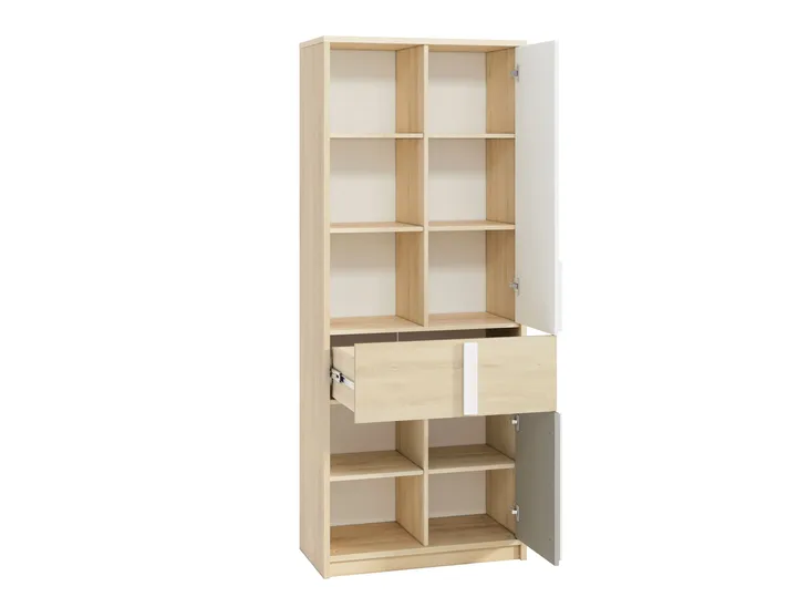 Regał 1 drzwiowy z jedną szufladą. Wewnątrz półki. Możliwość montażu bryły z funkcjonalnością PRAWO/LEWO. Zwiększona ładowność szuflady dzięki specjalnemu wzmocnieniu dna.