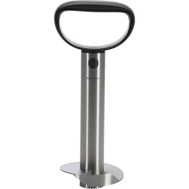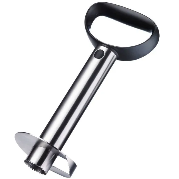 Praktyczna krajalnica do ananasów, obiera i kroi całe owoce ananasa do doskonałych sałatek owocowych, półmisków, deserów i musli w jednym kroku. Wkręcając nóż w ananasa, nacinamy spiralnie miąższ i jednocześnie wydrążamy owoc. Ostry, ząbkowany pierścień tnący wykonany ze stali nierdzewnej zapewnia łatwe przekłuwanie i drążenie ananasa. Świeżo ściętą spiralę można przekształcić w gotowe do podania plastry, po prostu w nią nacinając. Zaleta: Ponieważ skórka pozostaje nienaruszona, nie dochodzi do utraty soku. Wydrążoną skórkę ananasa można wykorzystać jako pojemnik.